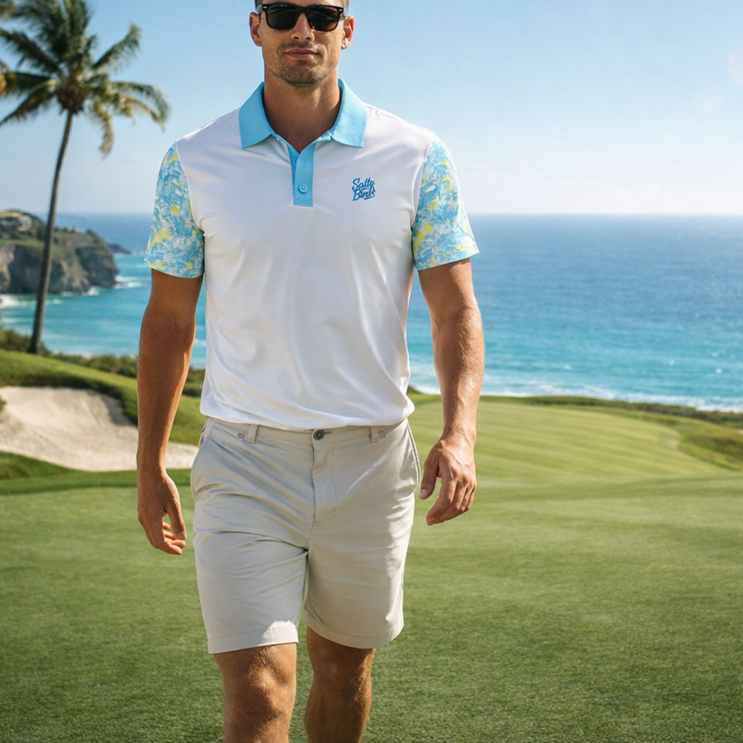 Pina Breeze brings coastal heat to the fairways with its crisp white body, sky blue collar, and tropical skull pineapple sleeves inspired by sun, salt, and summer rounds that turn into long afternoons.
